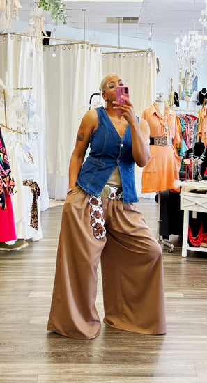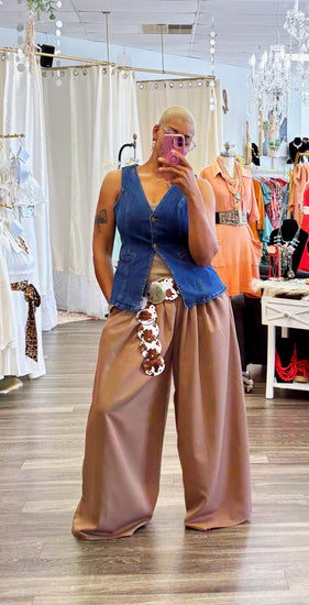 These brown wide-leg bottoms offer a relaxed yet refined silhouette, designed in a versatile one-size fit. Featuring a drawstring waist tie, they provide adjustable comfort and a personalized fit. Practical side pockets add both style and functionality, making these bottoms a smart choice for effortless everyday wear.