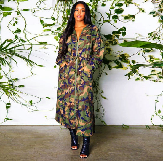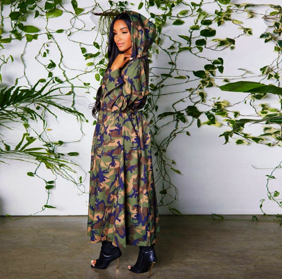 This camo jacket dress combines the classic trench coat silhouette with modern functionality. Featuring an adjustable waist tie for a tailored fit, a front design complemented by a back flap, and practical pockets, it offers both style and convenience. Ideal for layering, this piece balances rugged camouflage with refined tailoring, making it a versatile addition to any wardrobe.