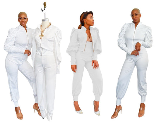 The Kelly White Track Set features a sleek stretch fabric designed for comfort and flexibility. Its distinctive button closures at the wrists and ankles add a refined touch, allowing you to effortlessly transition from casual to polished looks. Perfectly suited for dressing up or down, this set combines style and practicality in one versatile ensemble.