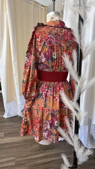 The Mia Print Pocket Dress features a floral pattern on a corduroy-like fabric, making it an ideal choice for cooler fall and winter weather. Its textured material provides warmth and durability, while the practical pockets add convenience without sacrificing style. This dress combines seasonal comfort with a refined look suitable for various occasions.