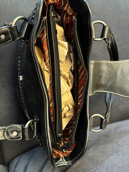 This Studded Detail Bag features a striking black and blue color combination that exudes sophistication. Its bold studded lining adds an edgy, contemporary touch, making it a standout accessory for those who appreciate both style and craftsmanship. Perfect for elevating any outfit with a confident, modern flair.